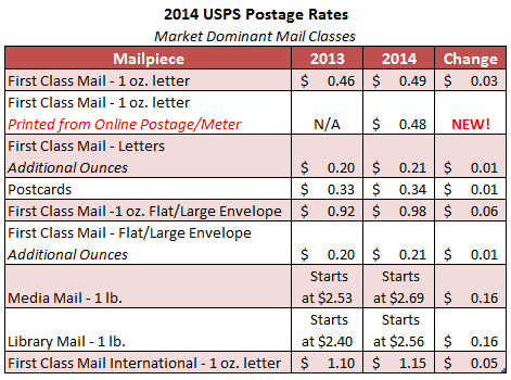The Postal Regulatory Commission (PRC), the governing body that approves U.S. Postal Service rate increases, has approved a special “exigent” rate increase for USPS market dominant products. Market dominant products include First Class Mail letters, First Class Mail flats/large envelopes, postcards, Standard Mail (bulk mail), periodicals, Media Mail and Library Mail. The new rates will go into effect on Sunday, January 26, 2014.