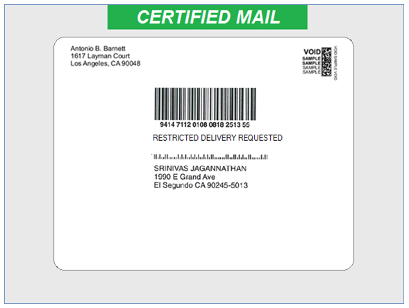 Example of 9″ x 12″ Certified Mail Window Envelope. Postage, address and all Certified Mail documentation are printed on a regular piece of paper, and then inserted into the window envelope.