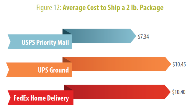 • The average cost to ship a 2 lb. package across all zones is $7.34 for USPS Priority Mail, $10.45 for UPS Ground and $10.40 for FedEx Home Delivery.