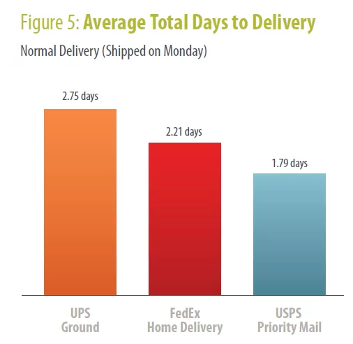 • For packages shipped on a Monday, USPS Priority Mail (1.79 days on average) delivered packages almost one full day faster than UPS Ground (2.75 days on average), and about a half day faster than FedEx Home Delivery (2.21 days on average).