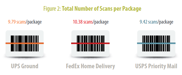 • The study measured package scans, the information transmitted back to customers to keep them informed of the whereabouts of their packages. The total number of package scans were almost identical among all carriers with the USPS at 9.42 scans, FedEx at 10.38 scans and UPS at 9.79 scans.