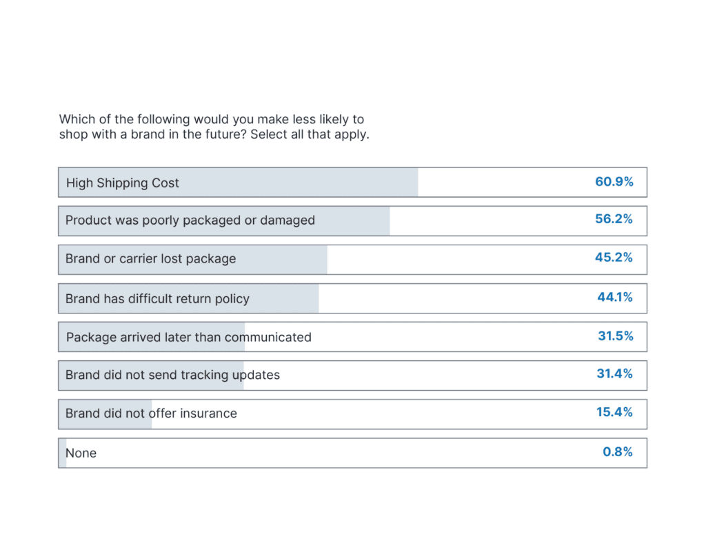 Additionally, you can make free shipping available for more expensive items to give customers an added incentive to complete their purchases. In our study, almost 61% of customers stated high shipping costs were the number one reason preventing their repeat business. Your business might not be able to offer free shipping on all purchases. But, your customers will appreciate the effort to incorporate free shipping where you can.