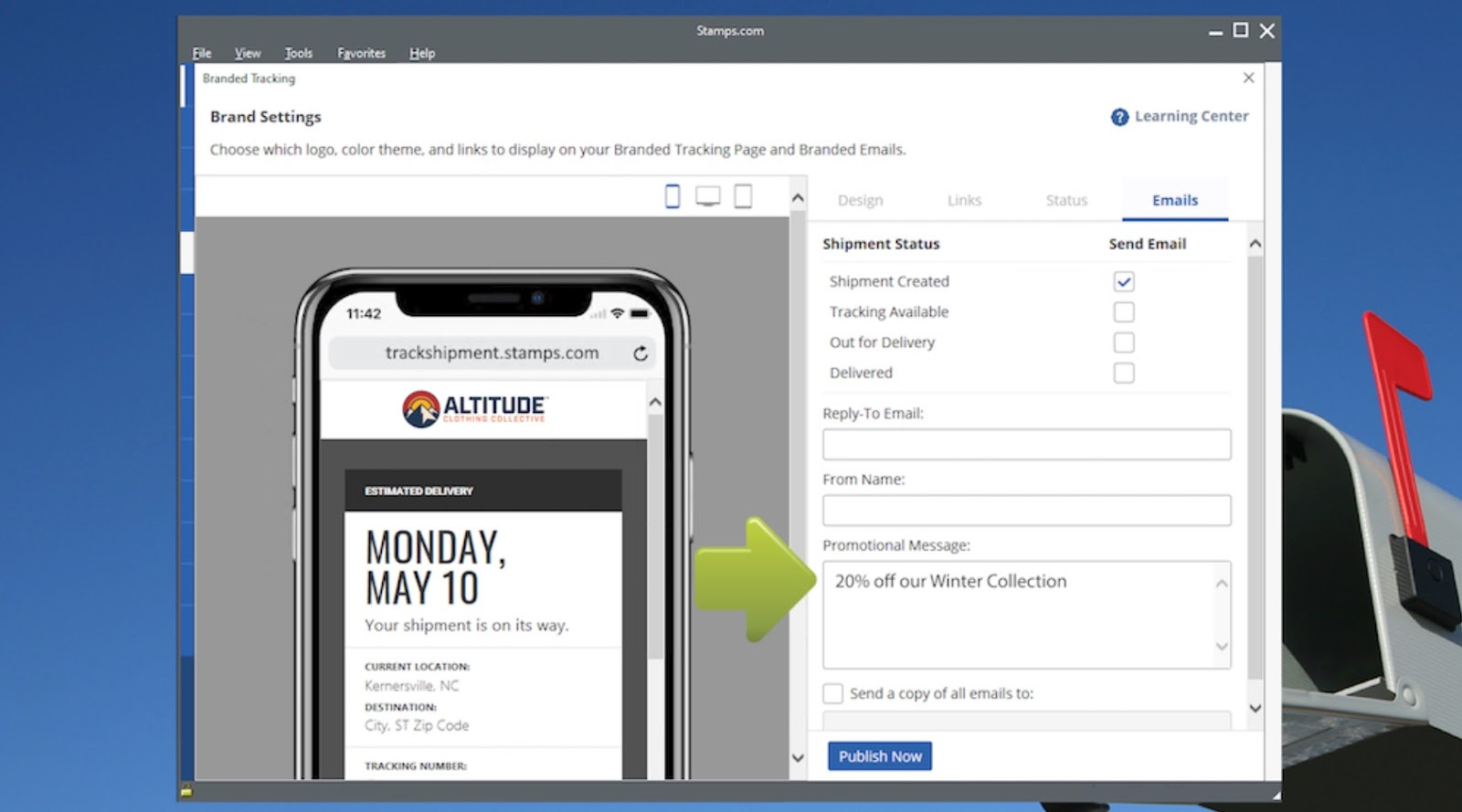 Social media isn’t the only way to promote free shipping! Stamps.com merchants can customize branded ship notification emails. These emails allow you to personalize a tracking page to include your logo, social media links, and a promotional message to boost the visibility of any running sales. Customers will receive emails throughout the shipping process, so they can take note of any sales. Those who order from your business regularly will be the first to know about free shipping or upcoming sales.