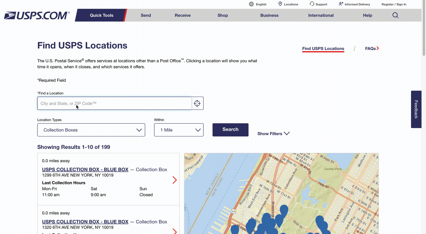 Additionally, packages can be dropped off at your local post office. SCAN forms can be accepted by postal workers at the counter. However, if you have a large number of packages, you might be asked to pull around to a loading dock or to drop-off the packages at another location around the post office. You can find your closest USPS collection box or post office using their PO Locator tool.