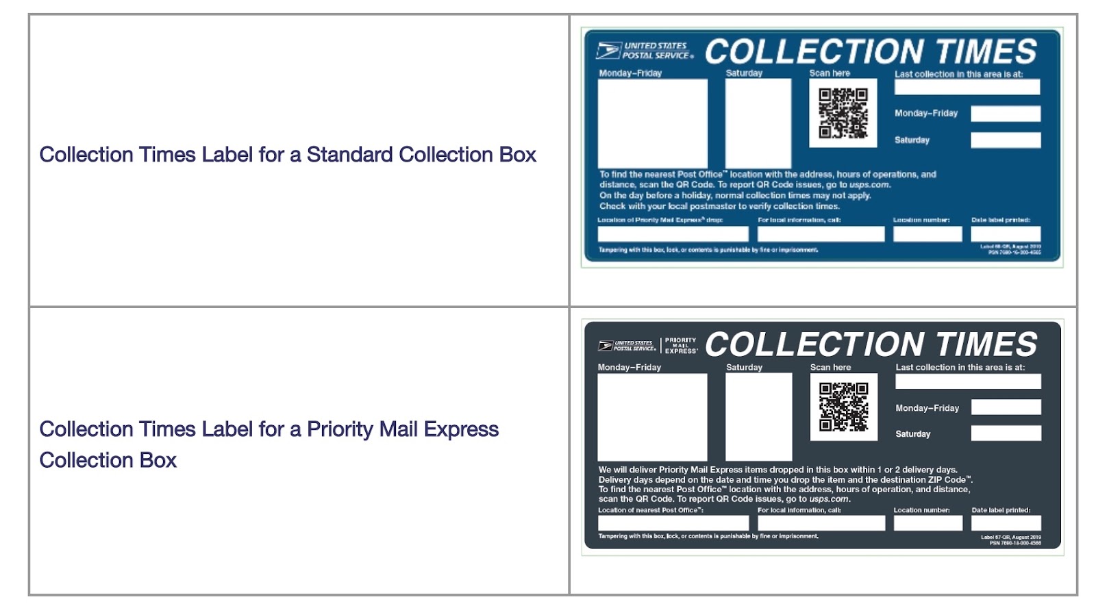 Look for the labels on the collection box to see when a postal carrier will retrieve packages and to determine if the collection box accepts Priority Mail or Priority Mail Express shipments. Collection boxes will also have scannable QR codes which send you to a post office locator tool. For more information on collection boxes, visit the USPS website.