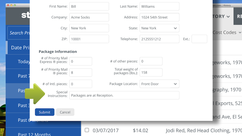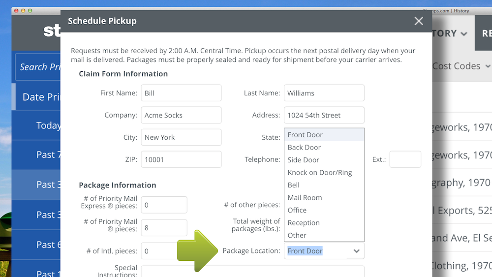 - Select where at your location the postal carrier will pick up your packages and include any necessary notes/information.