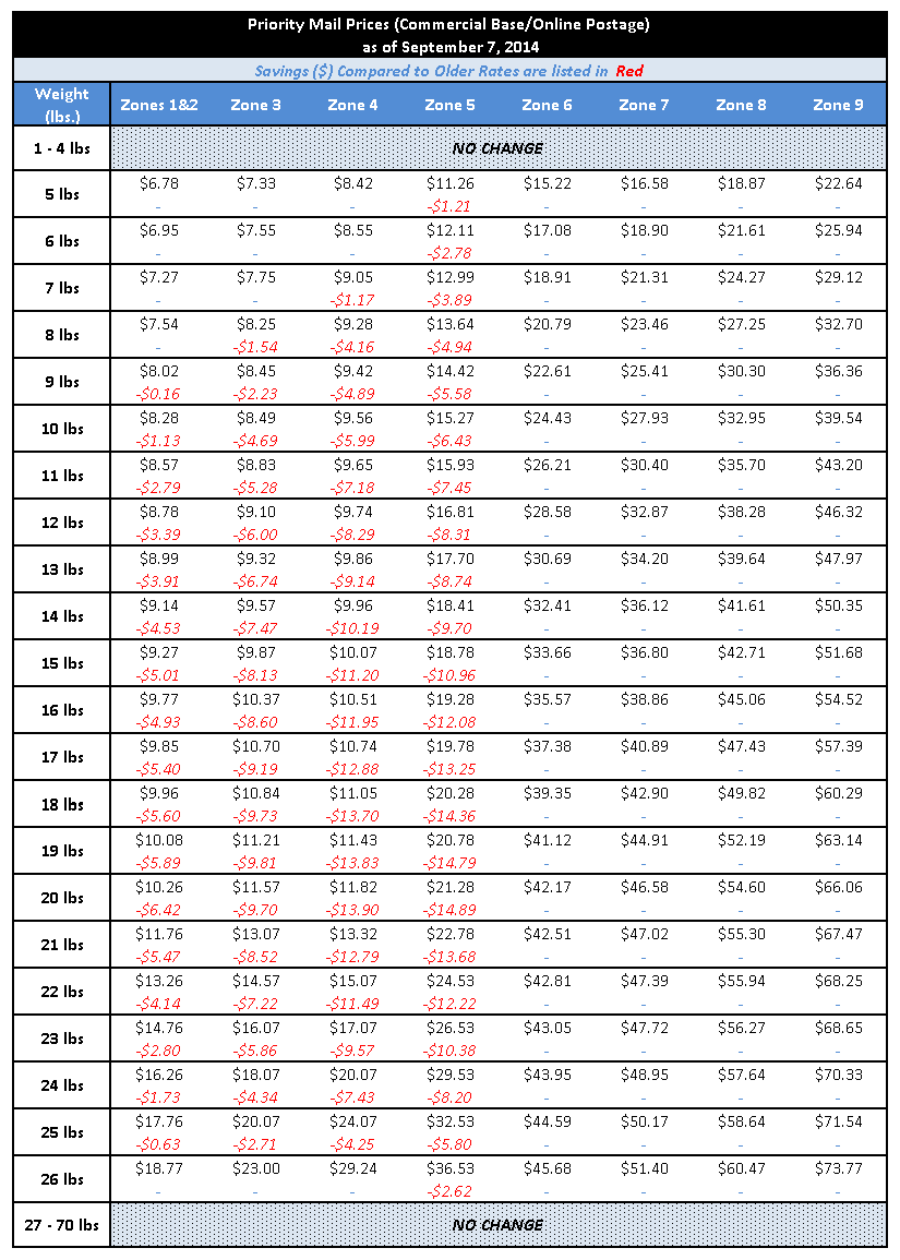 The table below shows the NEW September 2014 prices (along with the savings compared to the January 2014 prices listed in red) by package weight and shipping zone.