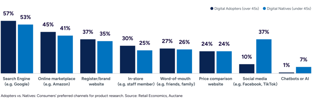 Customers can be categorized into two groups: digital natives and digital adopters. Digital natives are those under 45 who grew up with technology. Digital adopters are those who are over 45 and had to learn how to use technology. Within this generational divide comes a difference in delivery preferences. For example, 66% of digital adopters and 33% of digital natives said they would never pay for premium delivery services.