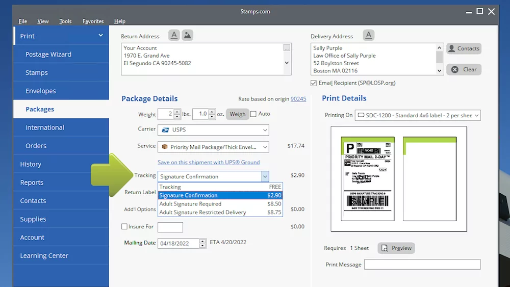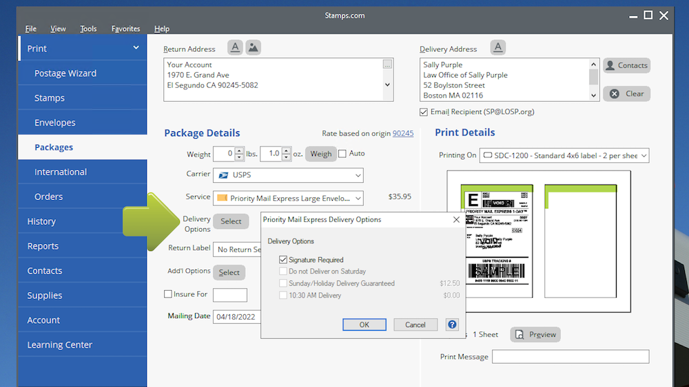 Once you select the mail class for your package, go to the Packages Tab on your dashboard. For shipments using Priority Mail Express®, click the Delivery Options button and select Signature Required.